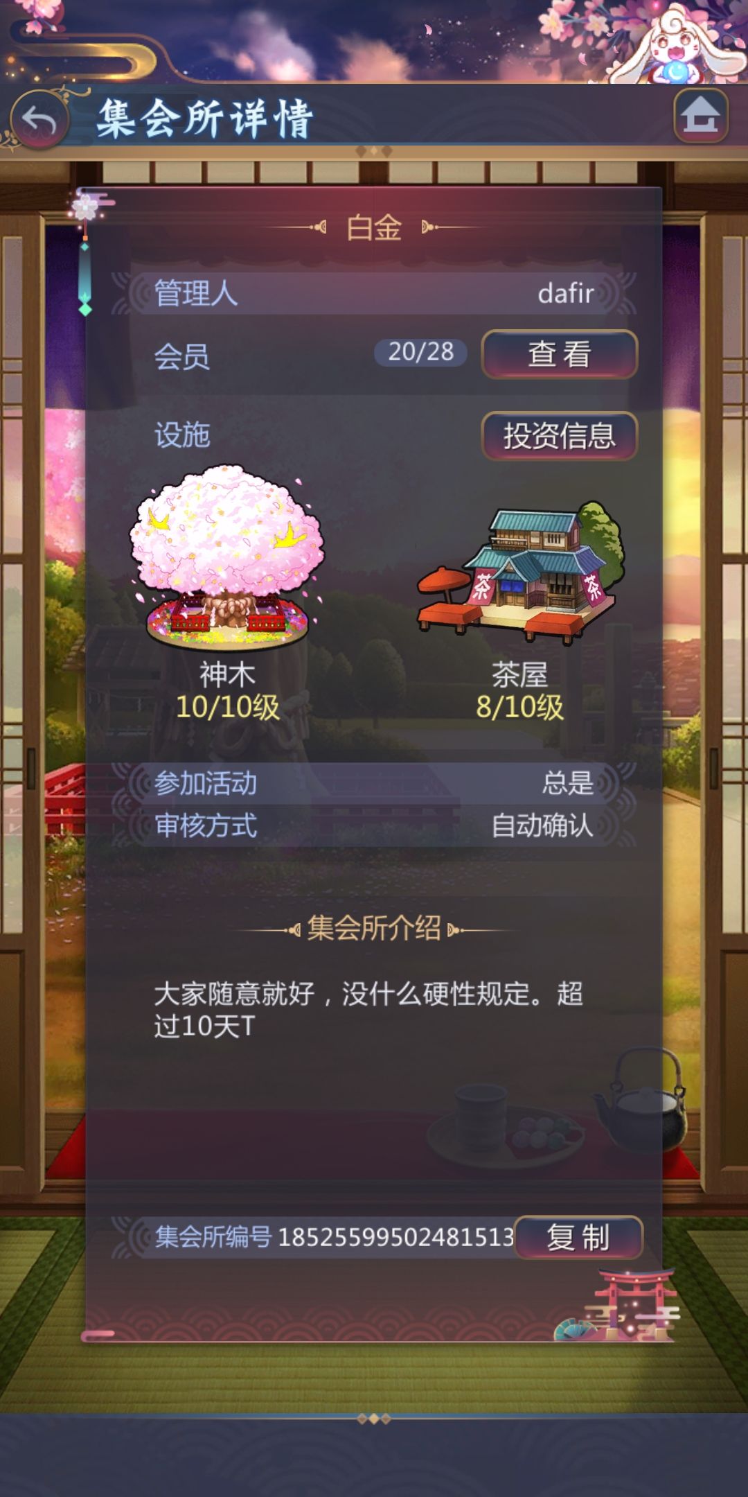 具体情况如下:养老所,还剩几个活人,态度都比较佛系,不怎么聊天;队长已经懒得清人了,所以就算有急事一段时间不上也没关系。唯一能够保证的是pt活动奖励能够肝满。
