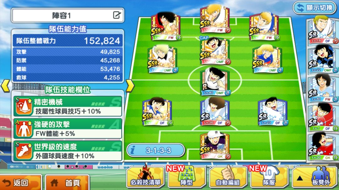 免费首抽出三衫纯,30球十连出的神之子,第一次凑够50球十连出了王者翼,之后两次十连均无货。。。直到昨天改成单抽8次出了皮埃尔,sr券出了火野龙马,这阵容我觉得勉强可以打吧,今天刚把sr若琳和SR切斯特都升级了ssr,感觉补强了许多。