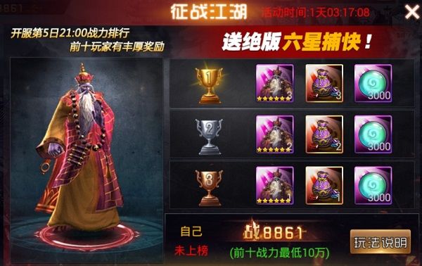 活动内容:开服第5日21点战力排行,冲进排行榜有机会获取6星捕快-无量大佛!以武成佛的大师,真言梵咒和达摩掌法修炼至十二重的隐世高手!详情请查看主页面征战江湖!