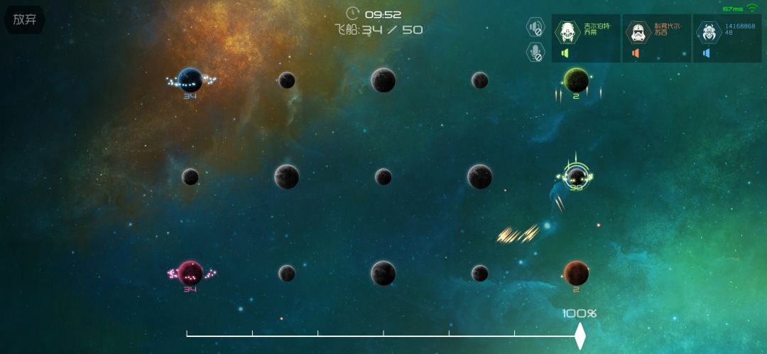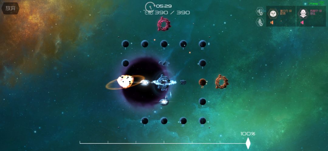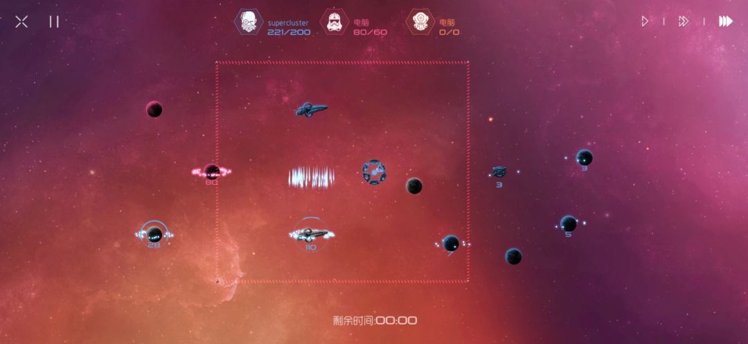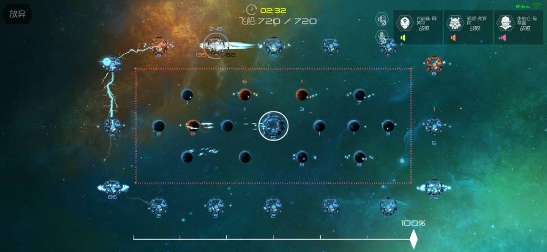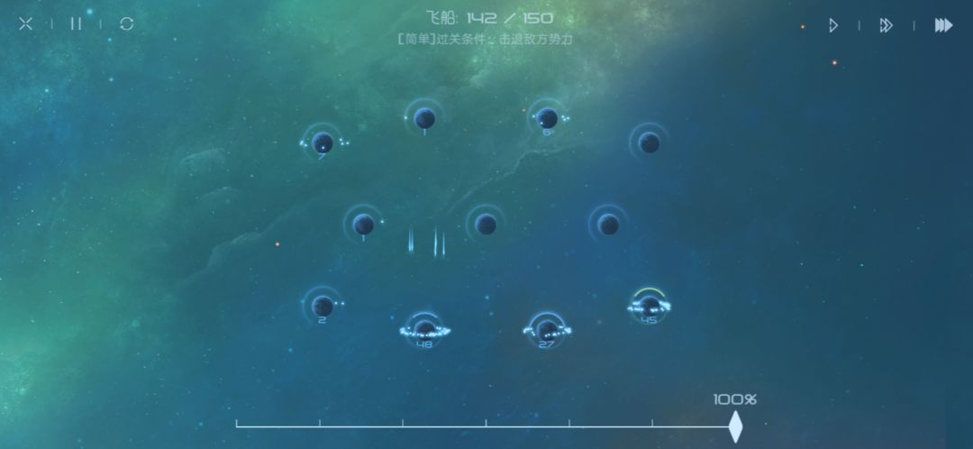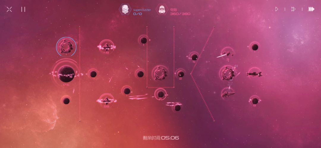 16、一方在没有天体,30秒后将被系统抹除时,如果飞船在飞行中,则有可能系统无法消除全部飞船,但显示战败。如果该方为玩家,则无法操控剩余飞船;如果该方为AI,则可以。