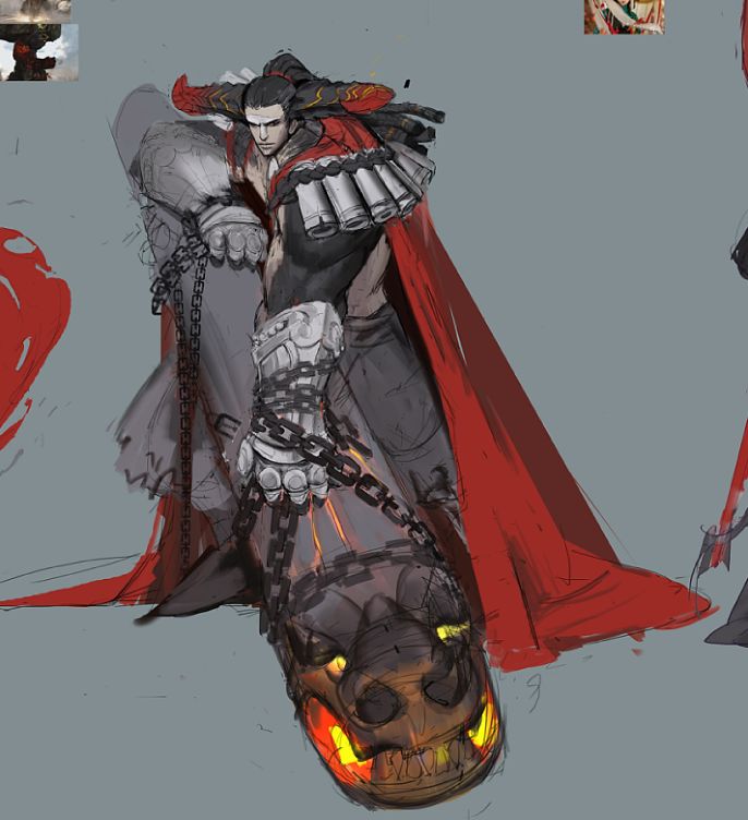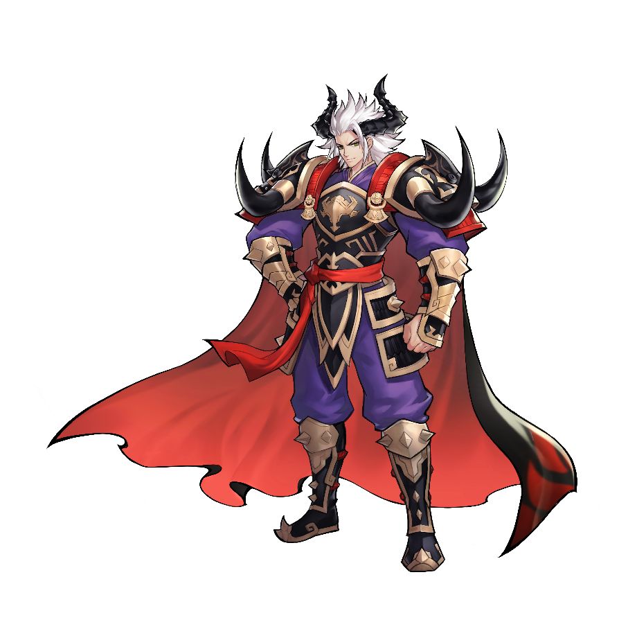 从故事出发,游戏剧情中牛魔王有相当的爱情戏份,美术上就要考虑牛魔王角色本身的吸引力,要年轻和洒脱。从技能与区分度出发,要从魔王三巨头中显示出最具力量感的牛魔王,就有了巨大豪放的武器。将这些要素综合在一起,再经过反复的调整和匹配,最终确立了牛魔王现在的形象。