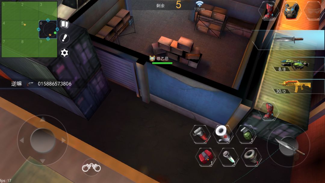 可以看见现在我角色所在的这个方位,如果敌人从下面走来,是无法发现我的人物模型的,只能看见我的血条。但是当我使用了伪装道具之后,敌人就完全无法发觉我的存在。
