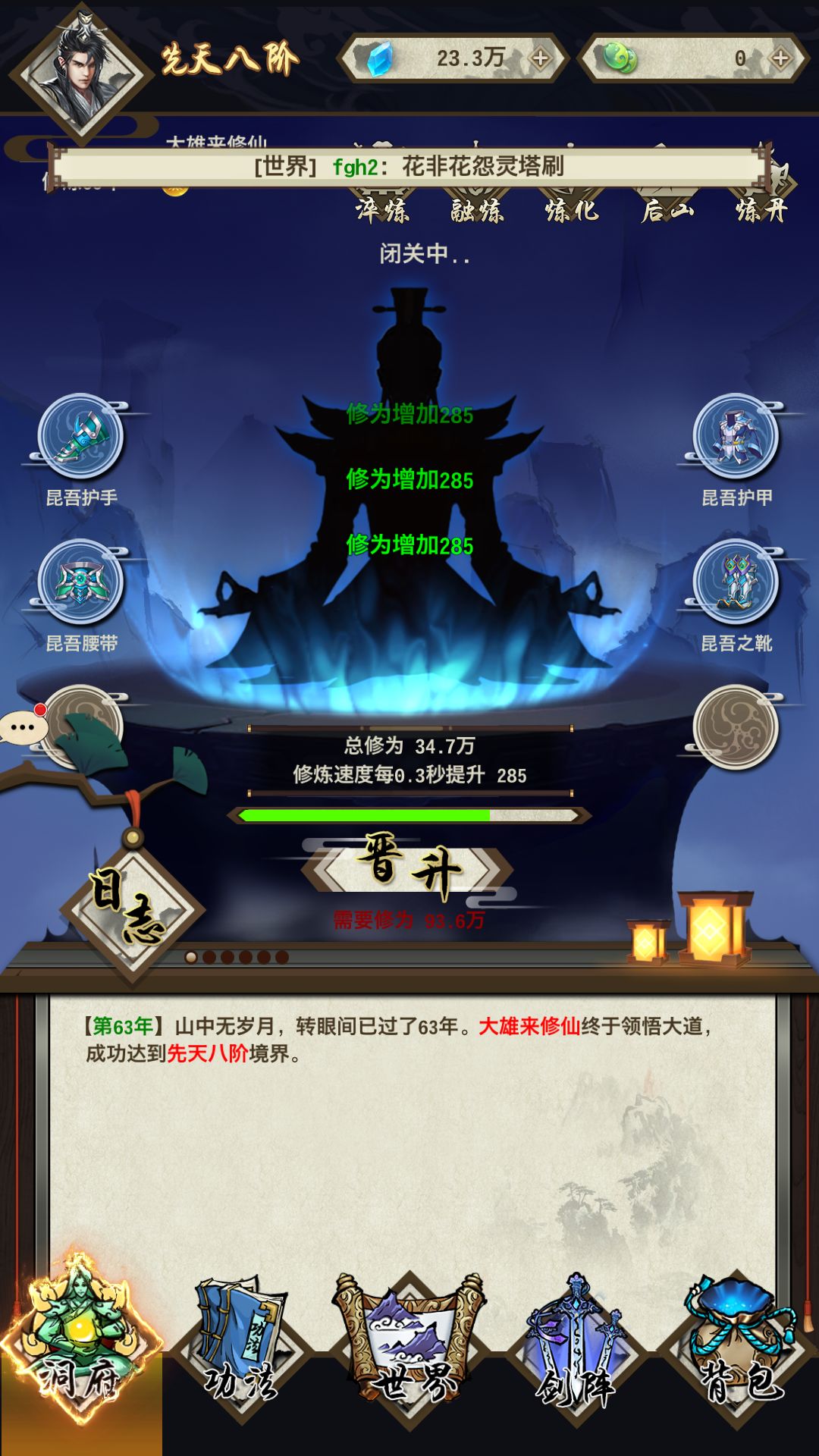 悄悄告诉你:挂机等道友渡劫失败,吃他们的骨灰可以很快到达后天境界哦,或者师门里面叫湿父传功哦(一般人我都不告诉他们^O^)
