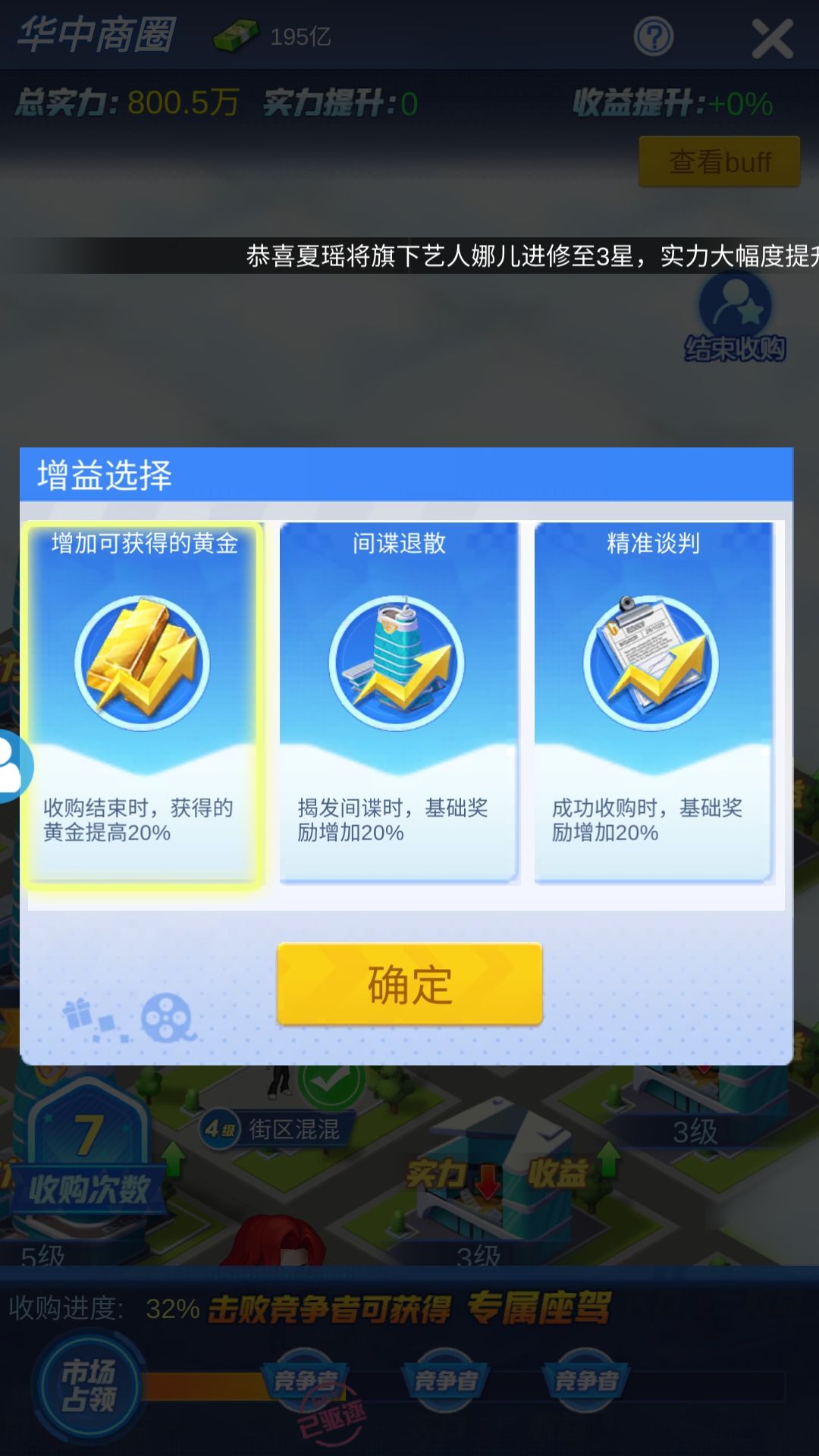 最开始不建议进行版图扩张,人物优先名媛和间谍(3级都可以),没有进行建筑的攻略,不要吝啬第一、二个的竞争对手奖励都选择实力档位。