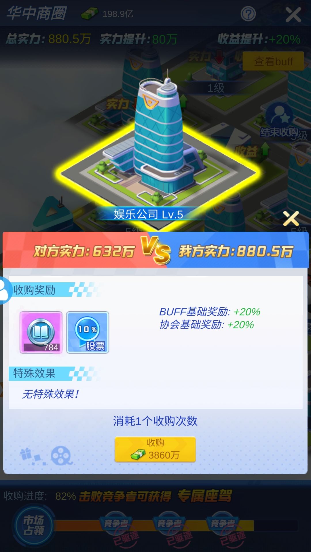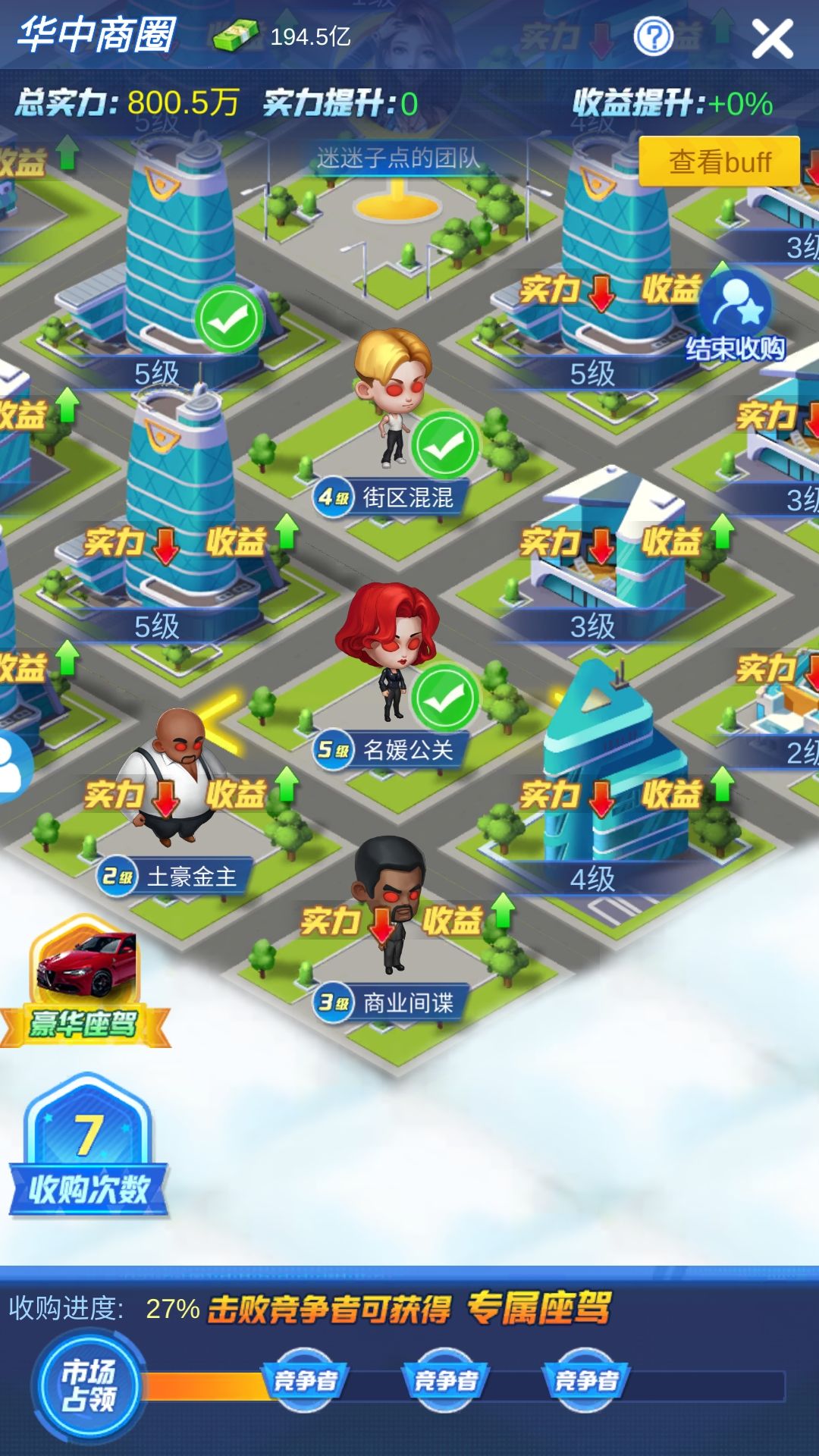 实力大于要求战斗力时,首先打5级人物(间谍、土豪、名媛、混混)后面人物不进行赘述统一用人物替代。如果没有5级人物4级也可以,如果实在没可以进行建筑的争夺,因为建筑没有特殊加成所以不考虑提前打。到了第一个建筑结束可以进行选择