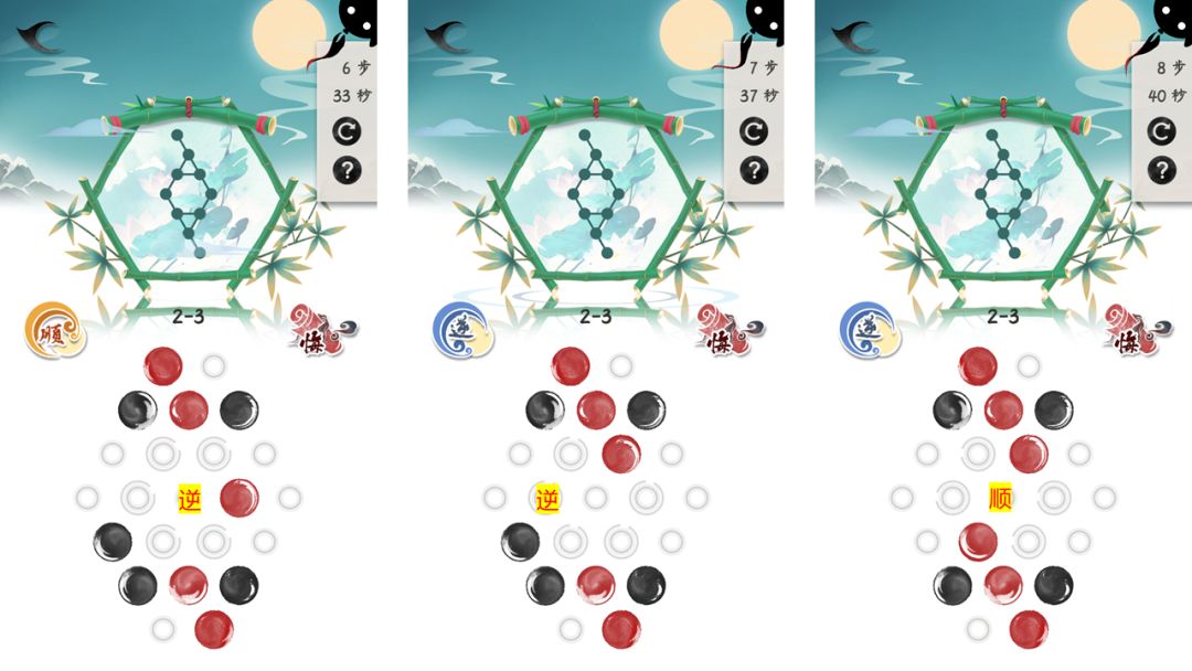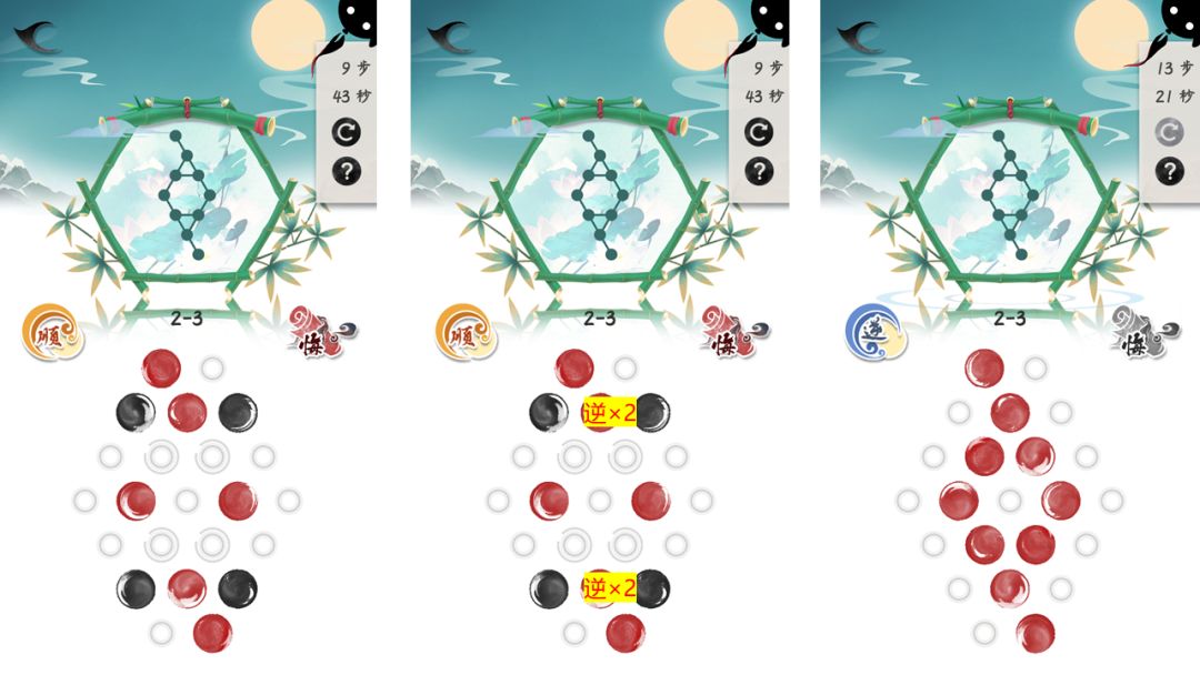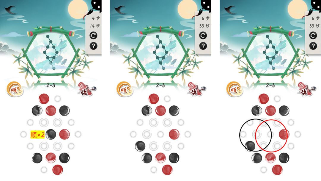 释义:将一部分墨点挪出环上,从而使你转动环时,不会影响你不想影响到的墨点。等到你把剩余墨点挪移完毕后,再将之前脱离环上的墨点原路转回来,即可完成设定的目标。