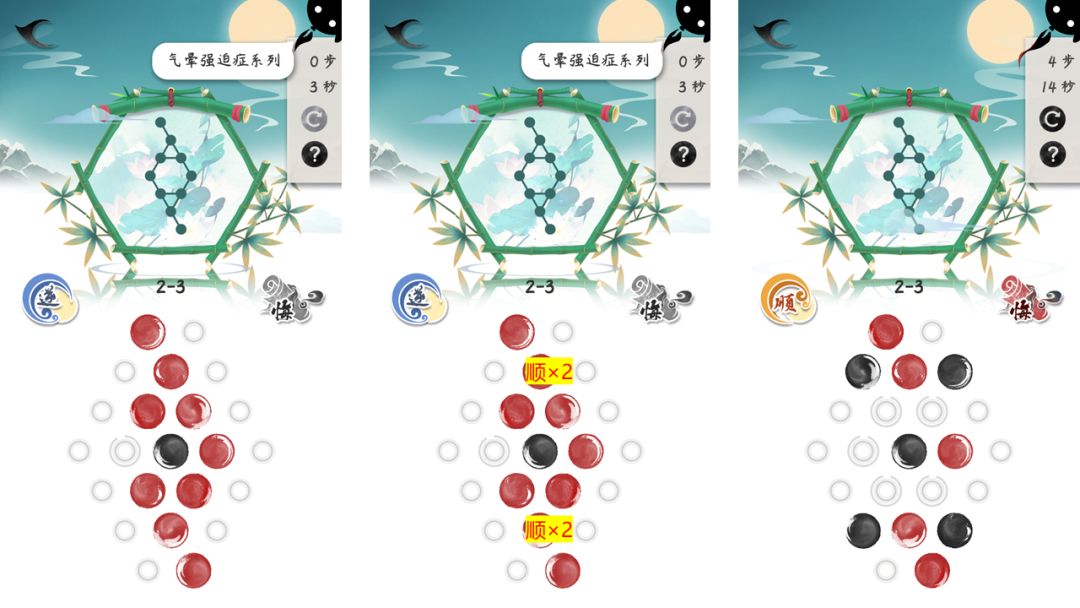 释义:许多时候由于各种相互影响,难以把墨点直接挪进目标。此时,我们可以先不考虑直接将墨点挪进去,而是在环上错误的位置,将墨点摆成一个与目标点相同的形状,然后再旋转环,使墨点在旋转后就可以一性填满所有的目标。