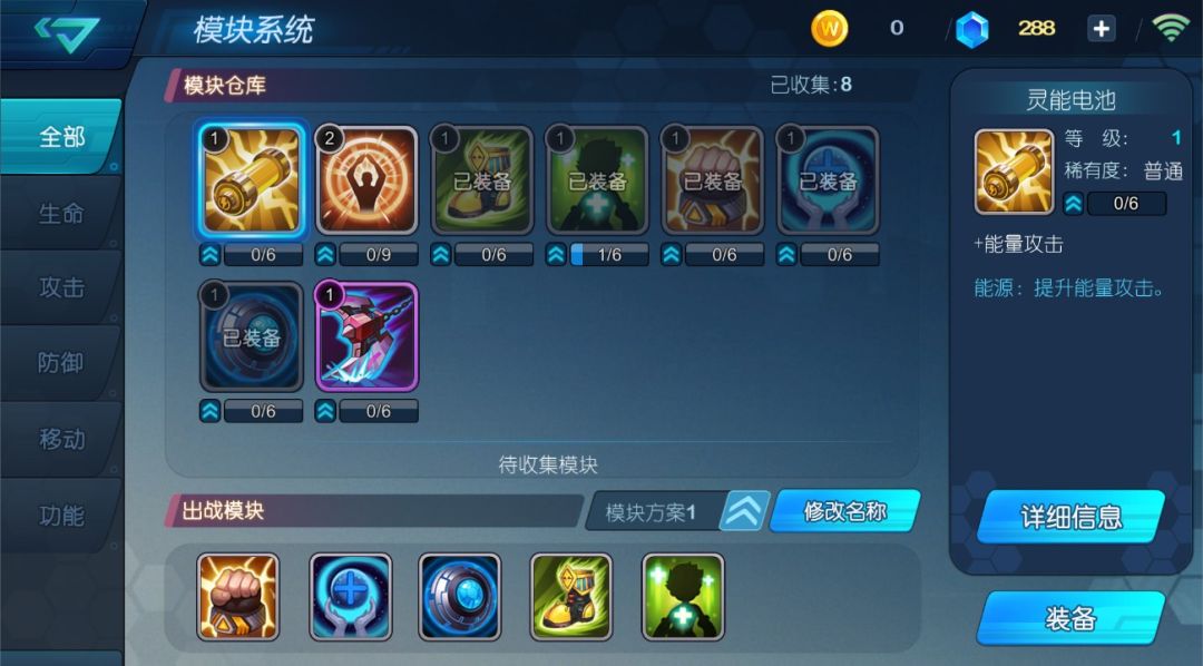 玩家选择五个相关模块带入战斗,在战斗中使用金币对该模块进行充能,用于提升属性,通常一个模块可充能2~5级。