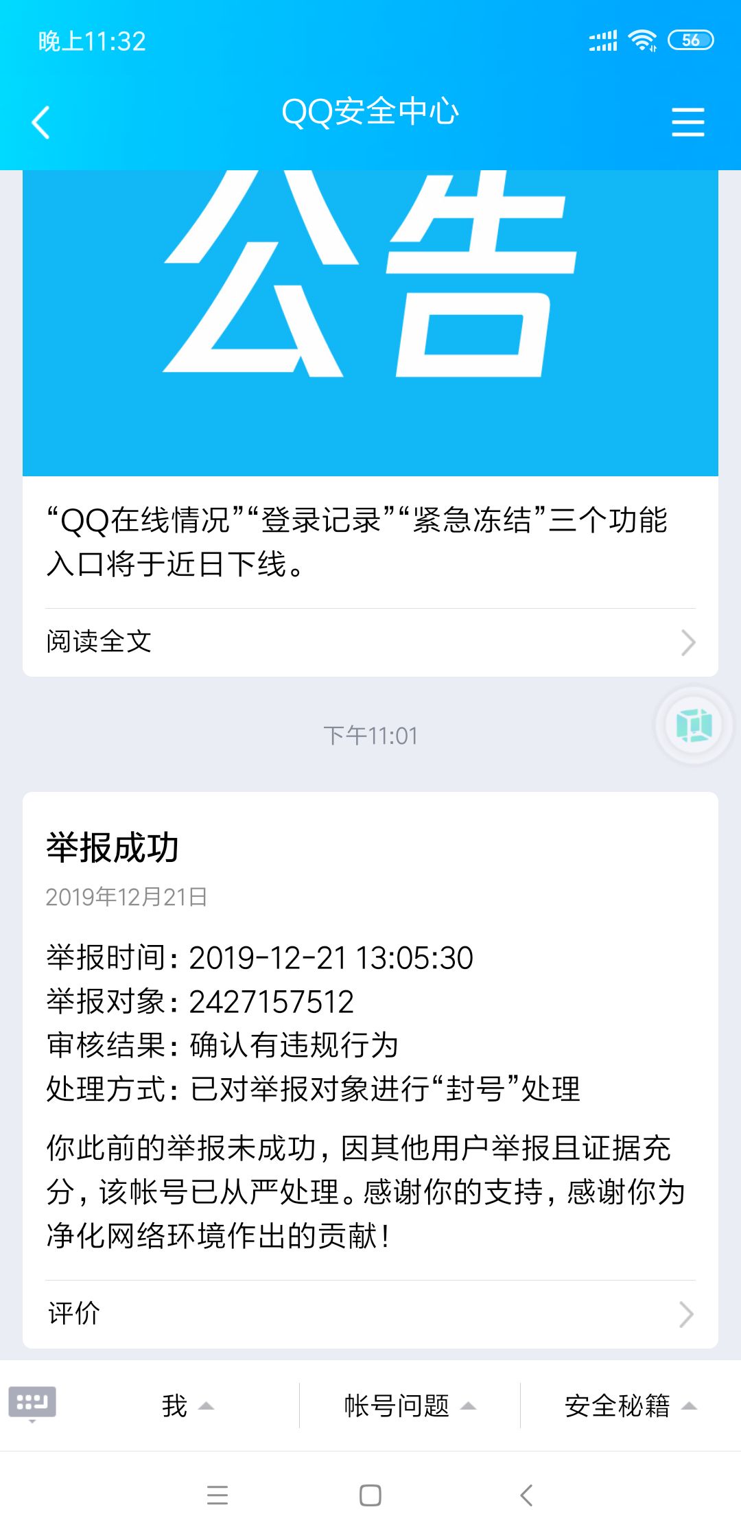 今天中午举报这个人没有结果,看上面我写的帖子应该就能发现,我不太善于表达这些,这个人应该是被多人举报了,也可以看出他的确有一些……大概就是这些吧。。
