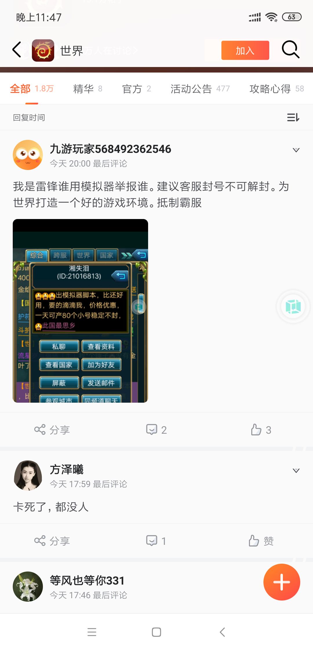 玩家是一个在校学生,因为平时学习所以挂了脚本,知道有风险,所以今天号被洗不说什么,但是不幸的是洗的同时用我号发布了一些违规的信息,本来这些垃圾信息,知道是正常id发的都是号被盗这种不由己的情况,但是这时候一个恶心人的东西看号是闪光就截图勒索我,要金要宠物什么的,否则就举报我,本身就不是喜欢吃这种亏的人,当时就拒绝了吧,后面的就是他在论坛和贴吧(九游)举报我两次后被冻结了,本身就只是休闲娱乐一下,没想到遇到这样恶心的事情,希望Tap和东哥能小小回复一下,如果可以能体谅一下,还有就是小心第三方软件,都有账号流失的可能,下面是一些相关的截图