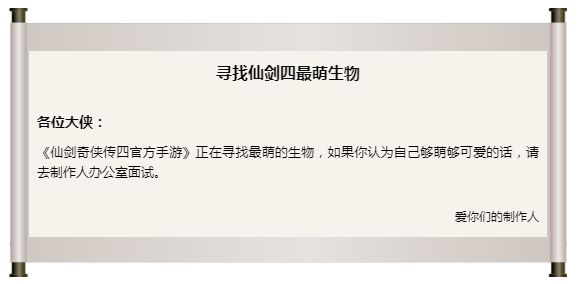 制作人大大:现在的问题是,我们很难判断谁才是仙剑四里最萌的生物,所以才贴出告示,希望萌物们来应聘~