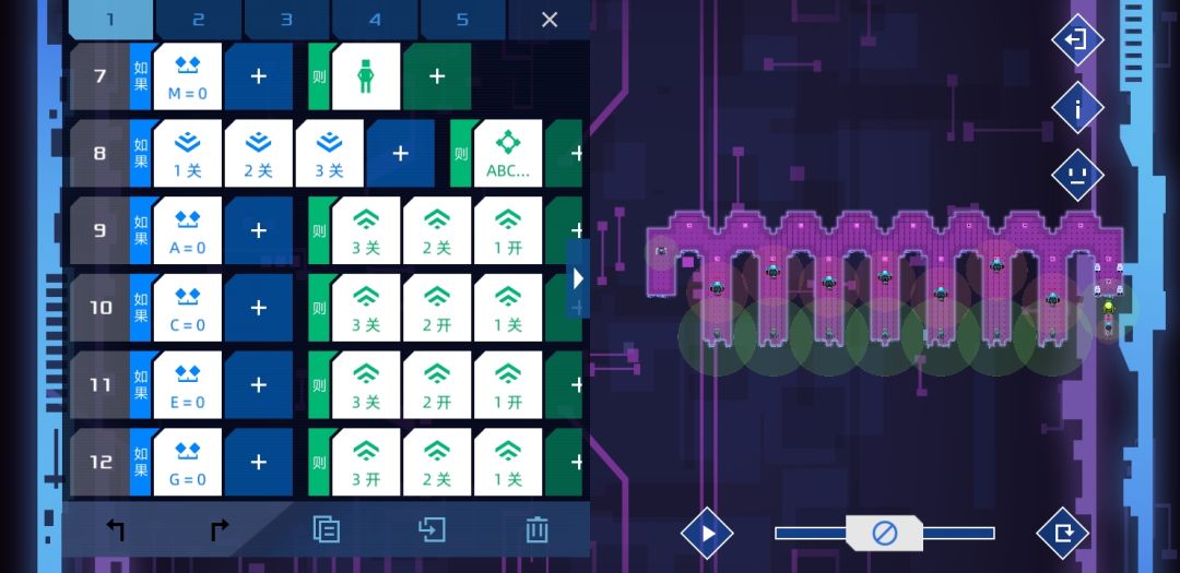 本关难度较大,从左到右我将5个单位分成12345号,先放代码如下
