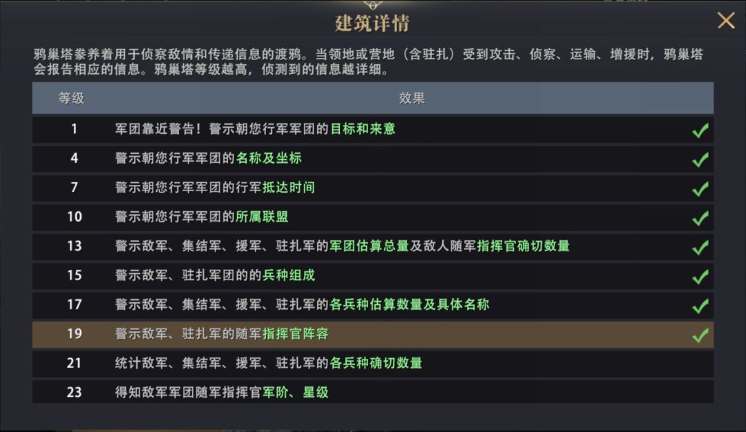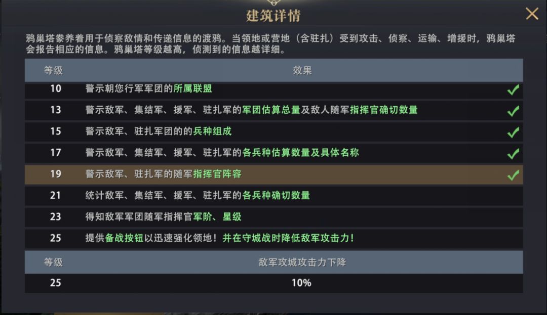 巢鸦塔的作用就是随着等级提高为领主提供更为详细敌军情报,方便领主做出决断。