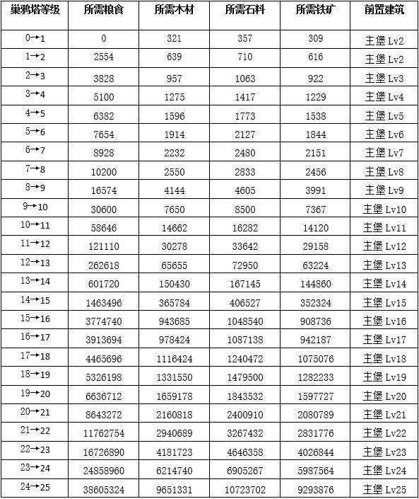 巢鸦塔的升级前置条件只有主堡等级作为限制,所需资源中,粮食的比例较高,升级难度相对较低,同时巢鸦塔的等级也是升11级、17级、23级主堡的前置条件,即需要10级、16级、22级的巢鸦塔才能够为主堡升级。