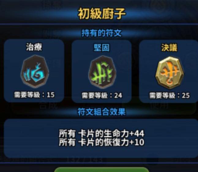 前期提升最大,而且容易入手的符文推荐初级厨师套,谁用谁知道,很多前期卡关的萌新,在有了初级厨子套以后,能够多推很多图。