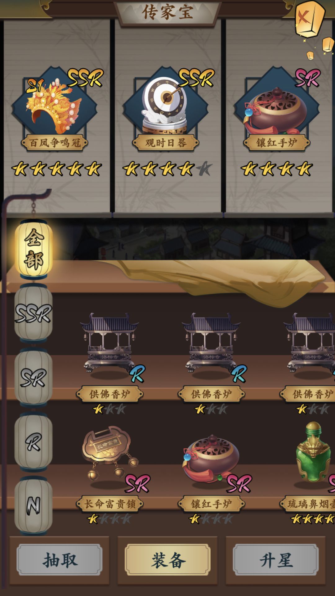 传家宝在初期建议就是带汉玉扳指(这玩意真的很监测欧值,性价比也很高)通灵宝玉(白女票它不快乐吗?)老坑洮砚(快速的积累名声,有名声才能拉存款啊)如果抽到抽到镶红手炉果断拉满换下通灵宝玉(安抚费真的是教你做人啊,曾经遭遇过最高1万多亿