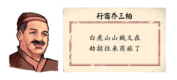 话还未说完,乔三柏就抱怨到:白虎山山贼长期以来一直为祸百姓,最近又在劫掠往来商旅,他新进的货就被抢走了,没有新的话本了。听完乔三柏的话,我感到非常愤怒,当然不仅是因为没有了新的话本,还因为山贼太嚣张,一直欺负百姓,心想现在自己也小有实力了,也该小试牛刀惩治一下这些恶匪了。