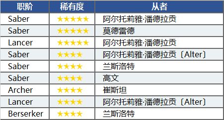 本次「圆桌骑士推荐召唤」出现的★5(SSR)、★4(SR)从者,必定来自于「圆桌骑士」。