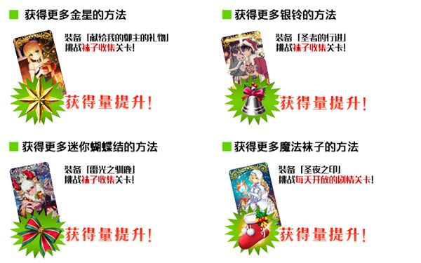 可分别提升活动道具「金星」「银铃」「迷你蝴蝶结」「魔法袜子」的掉落获得数量。