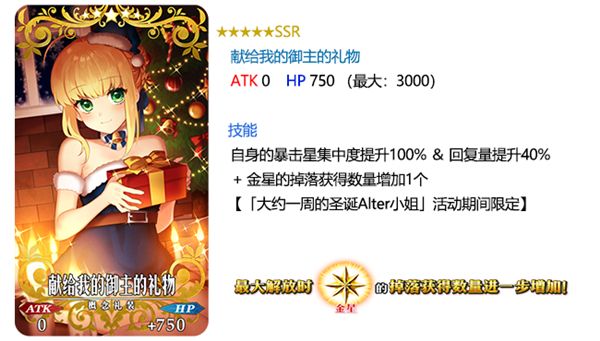 ※和2016年开放过的「大约一周的圣诞Alter小姐」相同,本次活动中,可以获得限定从者「★4(SR)阿尔托莉雅·潘德拉贡〔圣诞Alter〕」以及活动限定概念礼装。