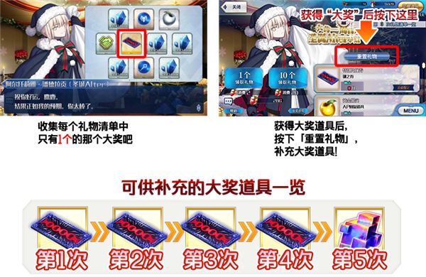 【大奖道具】第1~4次奖池:特别兑换券 第5次奖池:传承结晶 ※阿尔托莉雅·潘德拉贡〔圣诞Alter〕正式加入后开启商店兑换