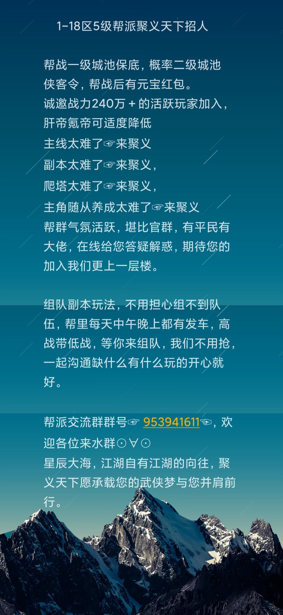 聚义天下招人240+战力玩家,欢迎1-18区的玩家加入,群号953941611