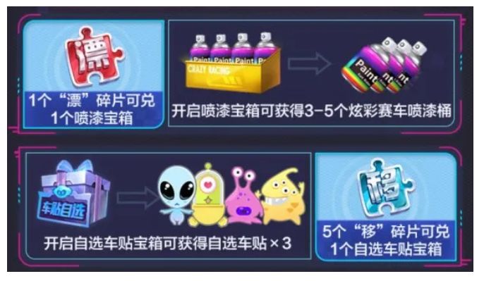 5.1-5.5期间,跑图每日掉落10个“漂”碎片和10个“移”碎片,1个“漂”=1个喷漆宝箱,开启可获得3-5个喷漆,5个“移”=1个自选车贴宝箱,开启可获得自选车贴*3。