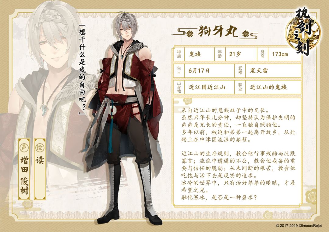 来自近江山的双子中的弟弟,天生双目失明且体弱多病,被族人视为累赘。跟随哥哥开始流浪后,一直希望自己能够在力所能及的地方帮到哥哥,努力学习各种技能,也在努力“活着”。