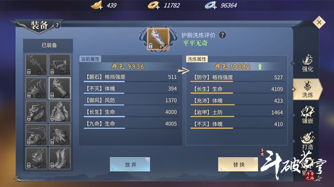 装备的强化也是非常重要的。70万斗气左右装备强化至少需要达到56级,也就是强化套装12级,每次到达一个强化套装就会额外增加600-700点斗气。强化等级到达40级之后就需要三级强化石,武器和衣服分别需要3个三级强化石,其他装备只需要2个三级强化石,若想提升一级最少需要22个三级强化石,每个三级强化石2000金币,提升一级至少需要44000金币。