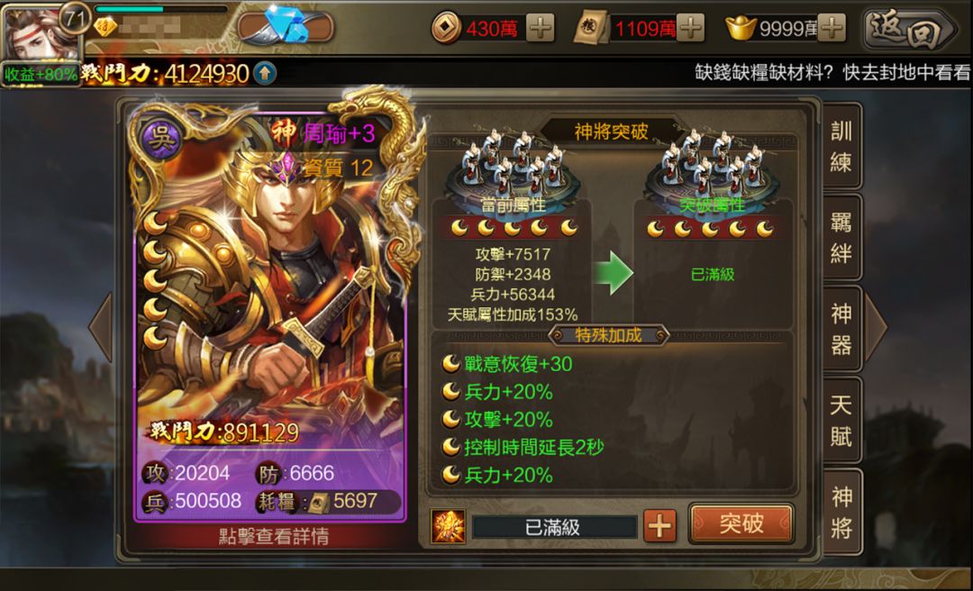 突破後的武將在各種屬性上都有很大的成長!選定一位神將優先培養吧!