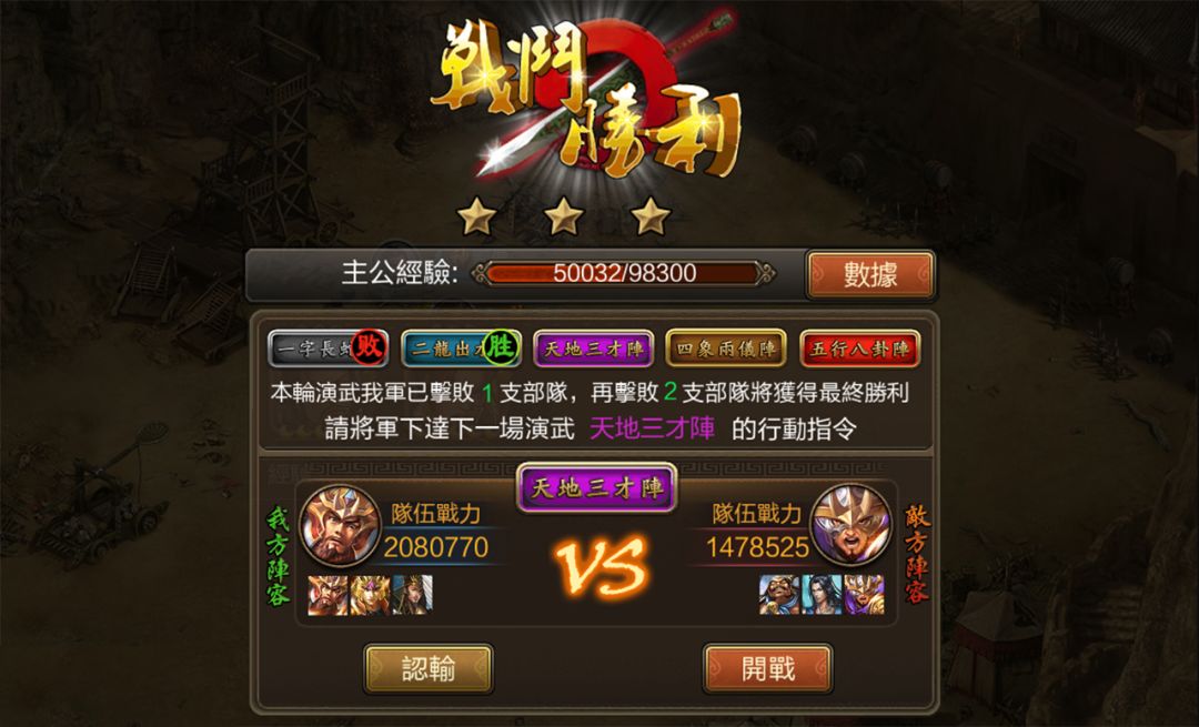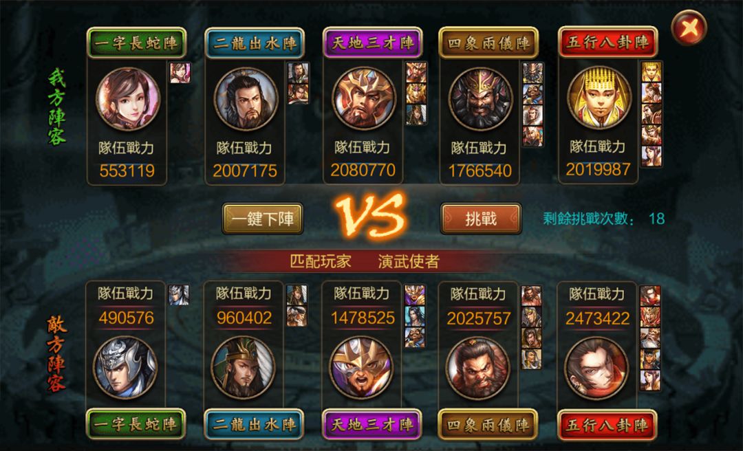 五種陣型依序進行對戰,可以視對手的戰力與武將調整隊伍喔!