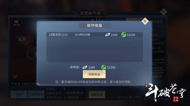 天焚炼气塔驻守也可以获取大量的经验。在已通过的的层数中选择一个位置进行驻守修炼,每半小时结算一次,最多可累计24个小时。层数越高获得的经验也就越多,斗者只需要每天登录点击天焚-驻守修炼-领取收益就可以获取大量的经验,10层以上每24小时就可以获取30多万经验。