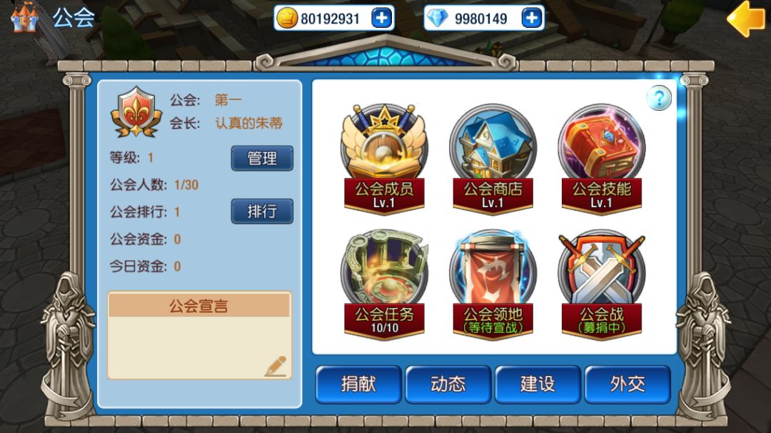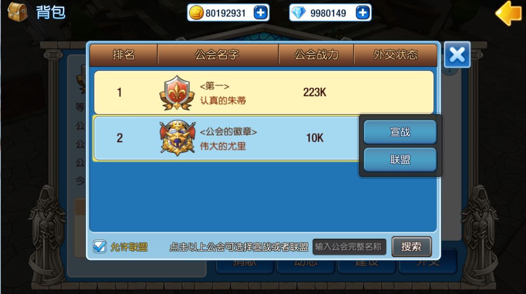 公会还可以进行外交设定,选择其他公会后,可以进行宣战或者联盟。