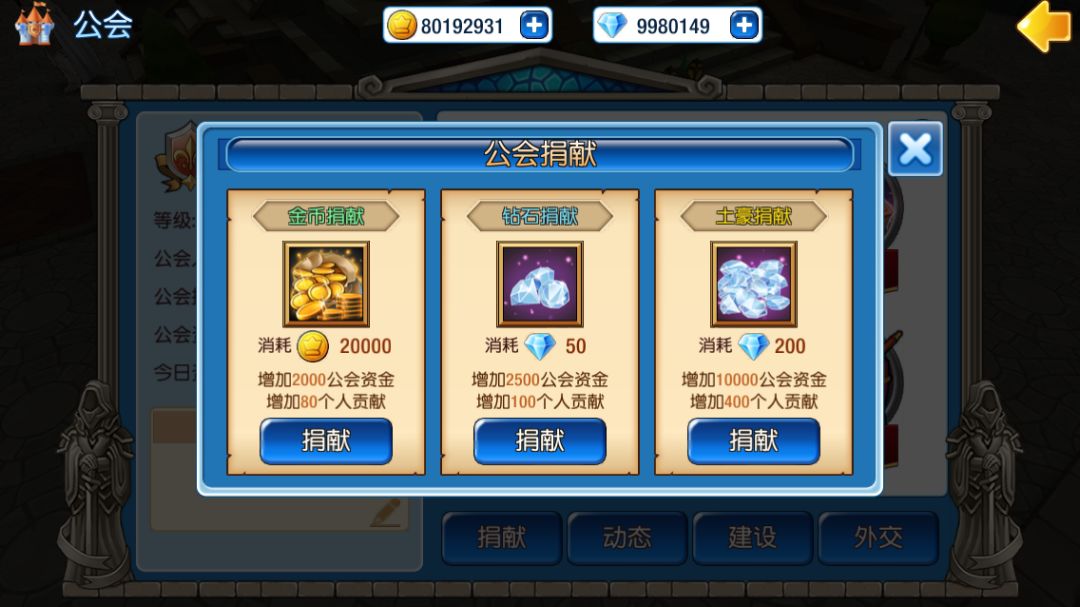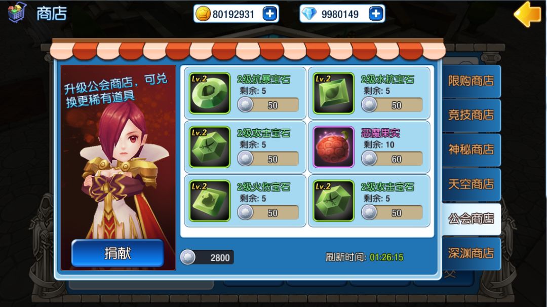 个人贡献可以去公会商店购买稀有道具,公会商店可以升级,等级越高可以兑换购买的道具就越稀有。