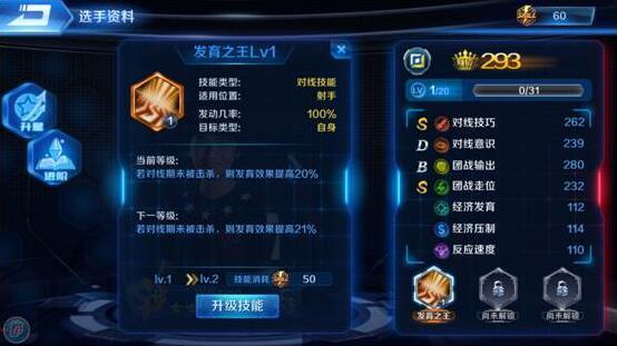 另外可选技能也是要以队伍核心打发来铺设的,例如之前举的例子中,Weixiao的其它两个技能可以学习强化对线,在其S级的对线技巧之上,加强对线能力,彻底压制对面下路,也可以学习对线意识,提高对线期间的存活率。