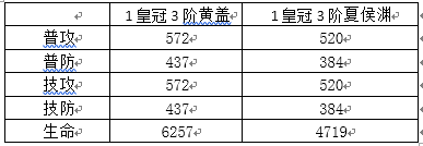 经过了漫长的点击后,小编将夏侯渊升星到了1皇冠3阶,次数总战力才打到14235,离目标还很远,我们先休息下,对比下相同升星阶段的A级黄盖和B级夏侯渊的5围数值。