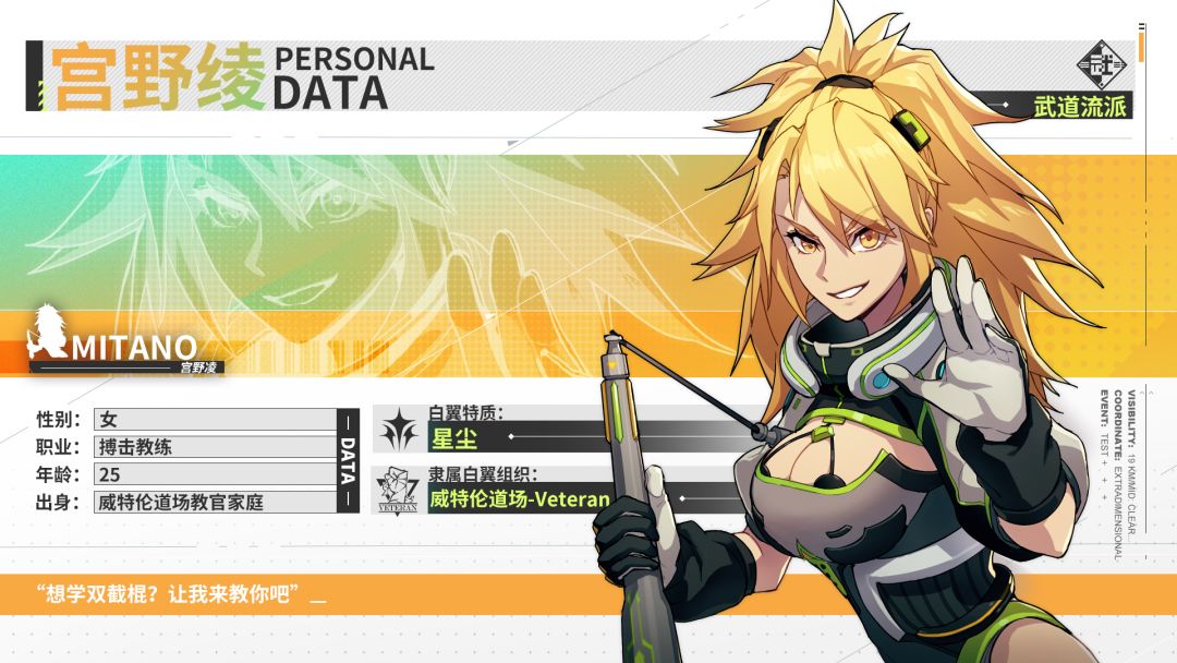 作为威特伦道场名门宫野家族的长女,宫野绫的性格继承其父,性格豪爽、直率,胆大心细,有正义感。年仅12岁的宫野绫已能较为熟练地掌握各类武道的基本技巧,尤其在双截棍方面展现出浓厚的兴趣。据其夫的口述,绫经常对着老电影模仿其双截棍动作,受偶像的影响在练武方面非常用功。