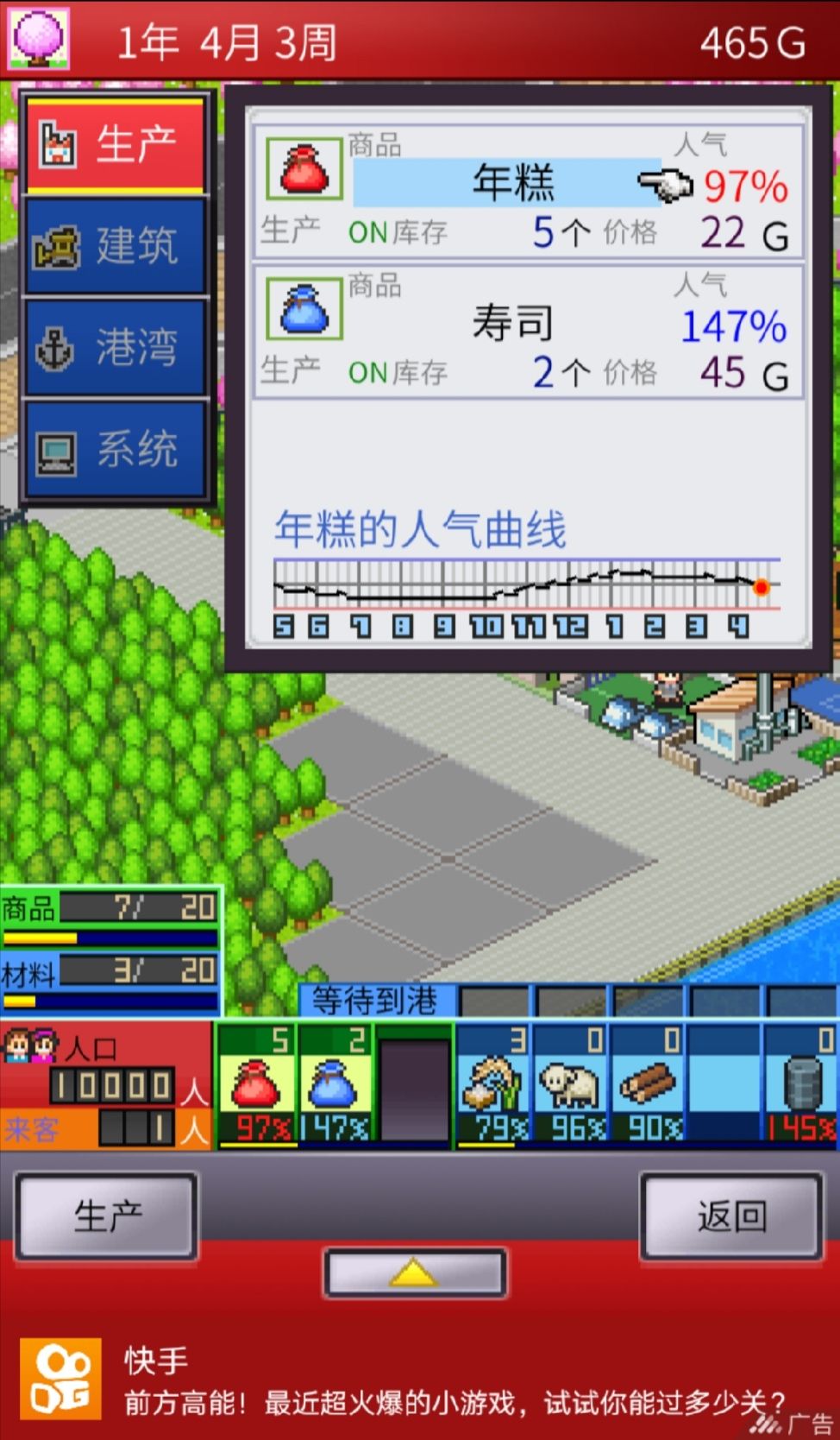 开局先挖两个地,造两个田,然后加商品寿司,当年糕低于100%时立刻取消商品(点击年糕,点击【取消该商品的交易】)。月底能在挖个地造田(钱多可以挖两个地不造田),吃到1000低保(如果没研究就放人气高的产品,后面自行研究)。然后把直售店和田中间的林子挖掉换工厂,然后再上个卖的商品。8月大概能攒到2000,在最左边挖地造个研究所并研究海图,研究完要点进去再退出。