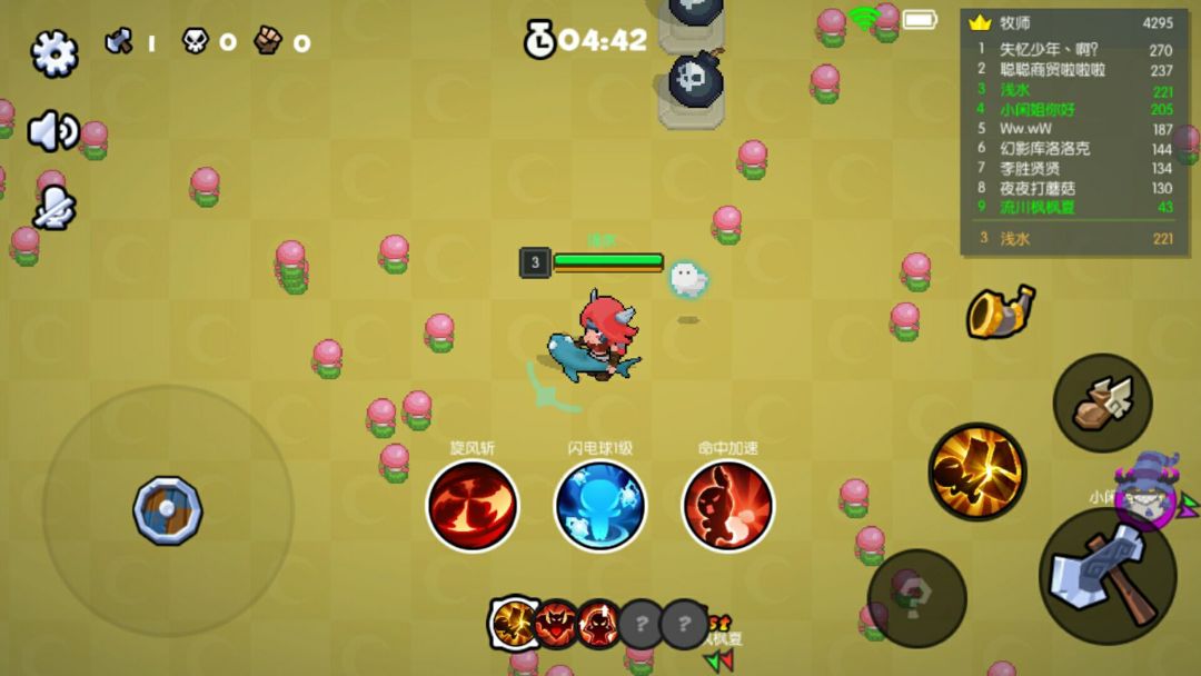 进一步把每个玩家控制的角色之间的差异扩大化的,则是游戏中的随机技能系统。每升一级系统都会随机给予玩家三个技能,可以从中选择一个。这些技能有被动型的吸血、加速等技能,也有防御性的格挡,主动攻击的飞踢等。不同的技能可以组合出多种打法和套路。