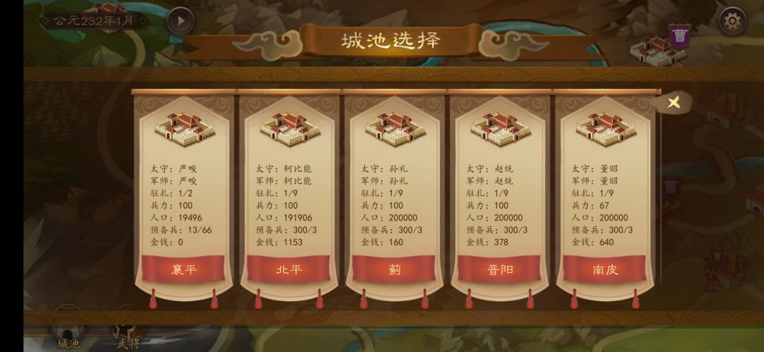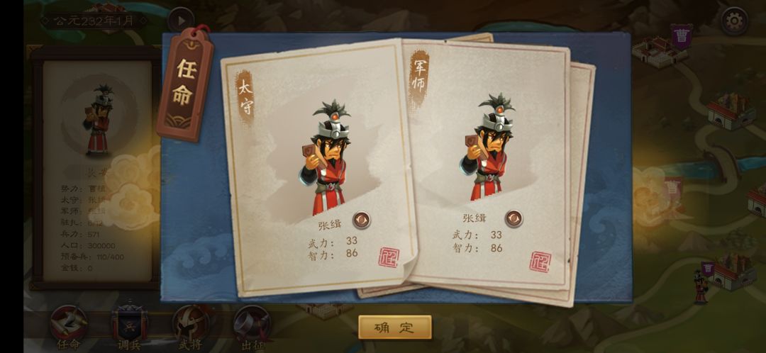 任命主要负责太守和军师的安排 军师建议高智力,这样被攻城军师技会有优势(一般智力高的军师技强)
