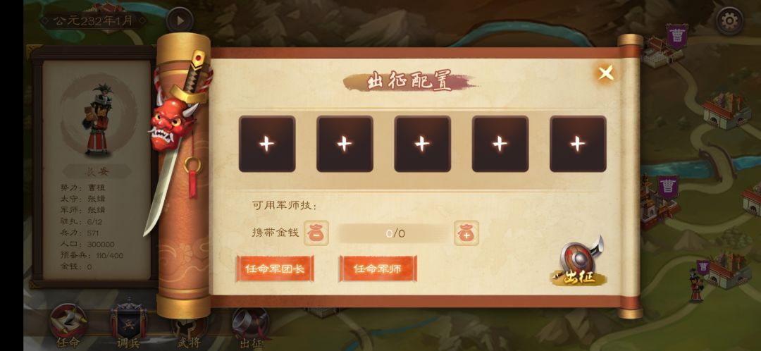 出征意味着攻打城池,最多五名武将,任命军团长和军师(军师负责军师技)