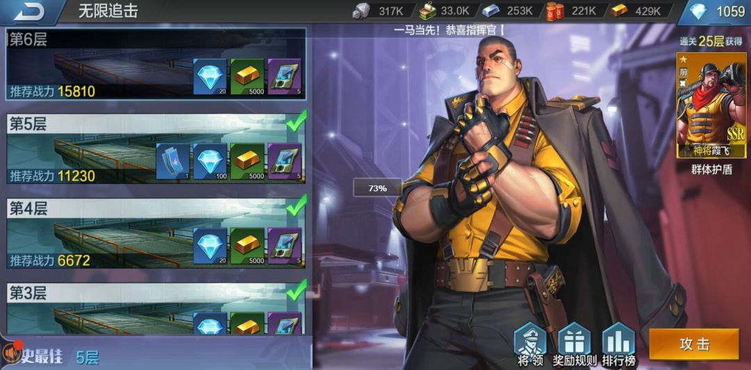 无限追击也作为日常副本的前期玩法,主要产出升星卡、黄金还有海量钻石。而通过特定关卡后,指挥官还有可能会获得SSR神将!