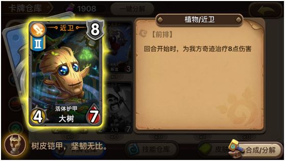 虽然这张卡取名叫做活体护甲,然鹅,他并没有护甲,不过三围还说的过去,4攻7血8费,2阶段英雄,大树蓝宝石一样的眼睛,有种莫名萌的感觉,都说橙卡看技能,他的技能可谓变态,是的,回合开始时,为我方奇迹治疗8点血,2个大树就是16点血,3个大树就是24点血,4个大树就是…然鹅,最多只有2颗树。。不过如果搭配的好,比如跟那个谁谁谁,谁谁谁,一起上阵,如果运气好,回满血不是问题,哪怕运气差一些,挺过一个回合也是能够恢复大量元气的嘛。