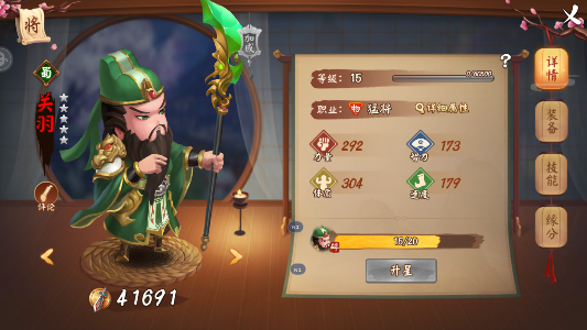 关羽,猛将,但是他猛就猛在他技能有回复,巨牛皮,可以说就这一点,就值这个价,虽然花了我不少钱,不过好在充值活动满优惠的。(下面的数值是15级关羽的,空装)