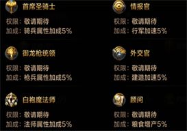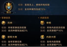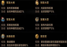 每个官职都有专属的加成,比如最高军事官员“元帅”拥有所有军事官员的权限和全兵种3%的加成;