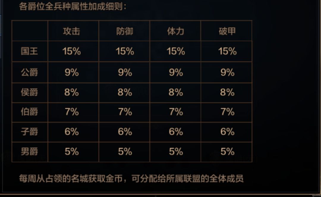 拥有爵位的领主也能为联盟的成员领取金币然后分配给全体成员,金币的多少和爵位的高低有关。