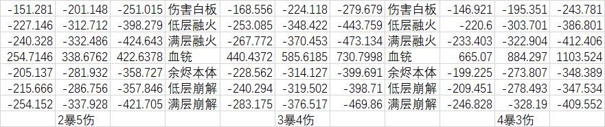 这个表是以全暴伤为参照,更换暴伤为暴击,算出预期伤害的变化值,正值为减少,负值为增加,可以看出,血铳在换上暴击后伤害期望减少,而其他套装在3暴4伤时取得峰值。