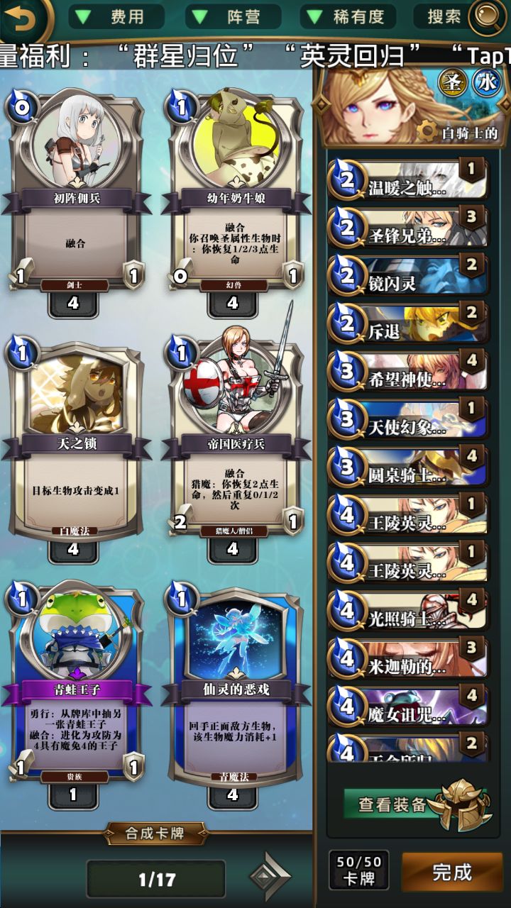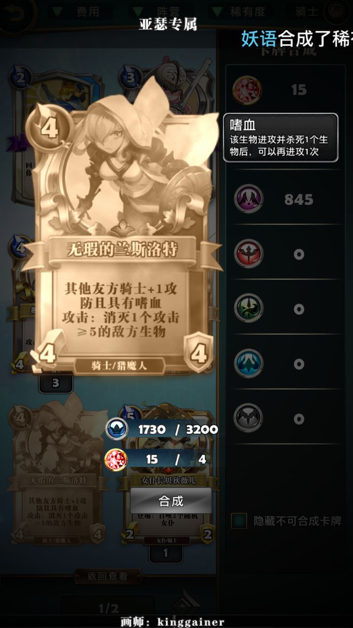 然后呢,有条件的,感觉可以加一到两张兰斯洛特,优质的解怪效果又能辅助骑士,被有嗜血,有不朽的骑士打起来可是很恶心的。更何况这套卡组有四张圆桌骑士,和两张王陵英灵,运气好打穿一路不是梦!