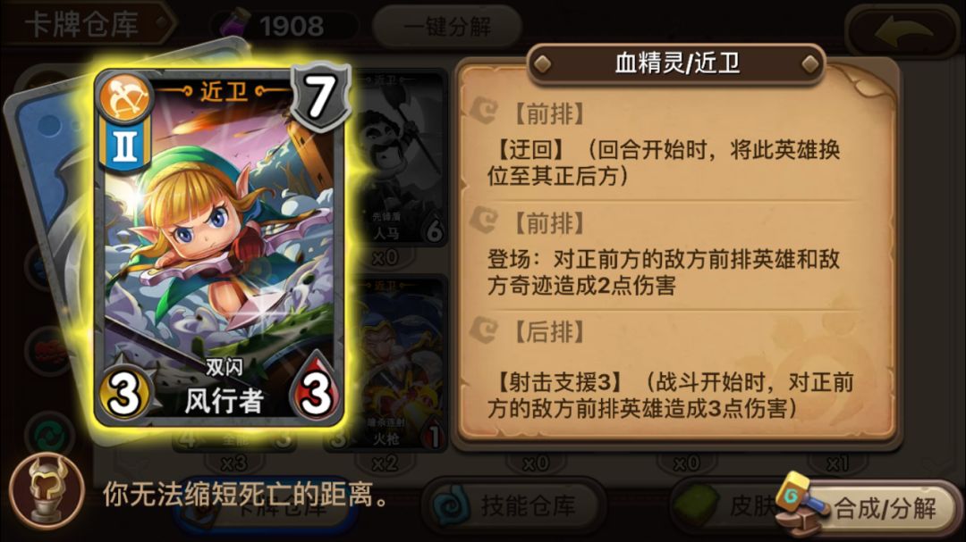 风行者这个卡牌不愧为近卫的神卡,单看三围的话,这张卡牌其实非常平庸,3攻3血7费,2阶段,但是,风行者拥有的技能多达3个,第一个技能【迂回】(回合开始时,将此英雄换位至其正后方),也就是说,回合开始的时候风行者会自动从前排回到后排,看上去并没有什么卵用,但是搭配登场技能就比较变态了,登场即对对面前排和奇迹造成2点伤害,这么猥琐的卡牌,居然还有一个后排技能,那就是【射击支援】大号的劣人即视感,在后排的时候给对面英雄造成3点伤害。