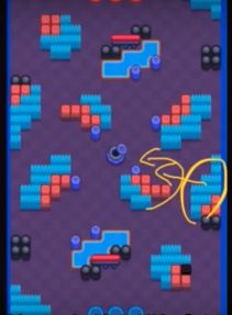 但不可能每场这么顺,如果你被对手占到这个位子,对方利用这个转角就能把我方中路给收掉,这时你应该等状态恢复后,在慢慢往上推进,此时对方会利用转角来消耗你的血量,你必须与对方卡在这个转角,等对方攻击空掉(利用左右走位)或者对方已被你消耗一波,你可以进右草往左边输出,但是你直接上去风险较高,因为对方中路很容易打到你,所以你可以先往右草在往左边攻击会稳点。